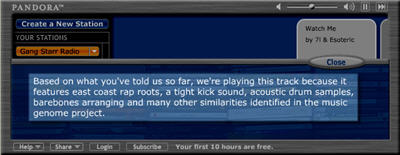 Pandora is a web front-end for the Music Genome Project that asks you one question: to name an artist that you like. Based on the "genetic makeup" of that artist's music, Pandora then plays music that it thinks you will like. As each song plays, you give it a thumbs-up or a thumbs-down, and Pandora takes this into account when playing future songs. It's a dead-simple interface, which makes using it an enjoyable experience. Pandora's music recommendation engine works remarkably well, and I've already discovered an interesting artist whose music I've never heard.